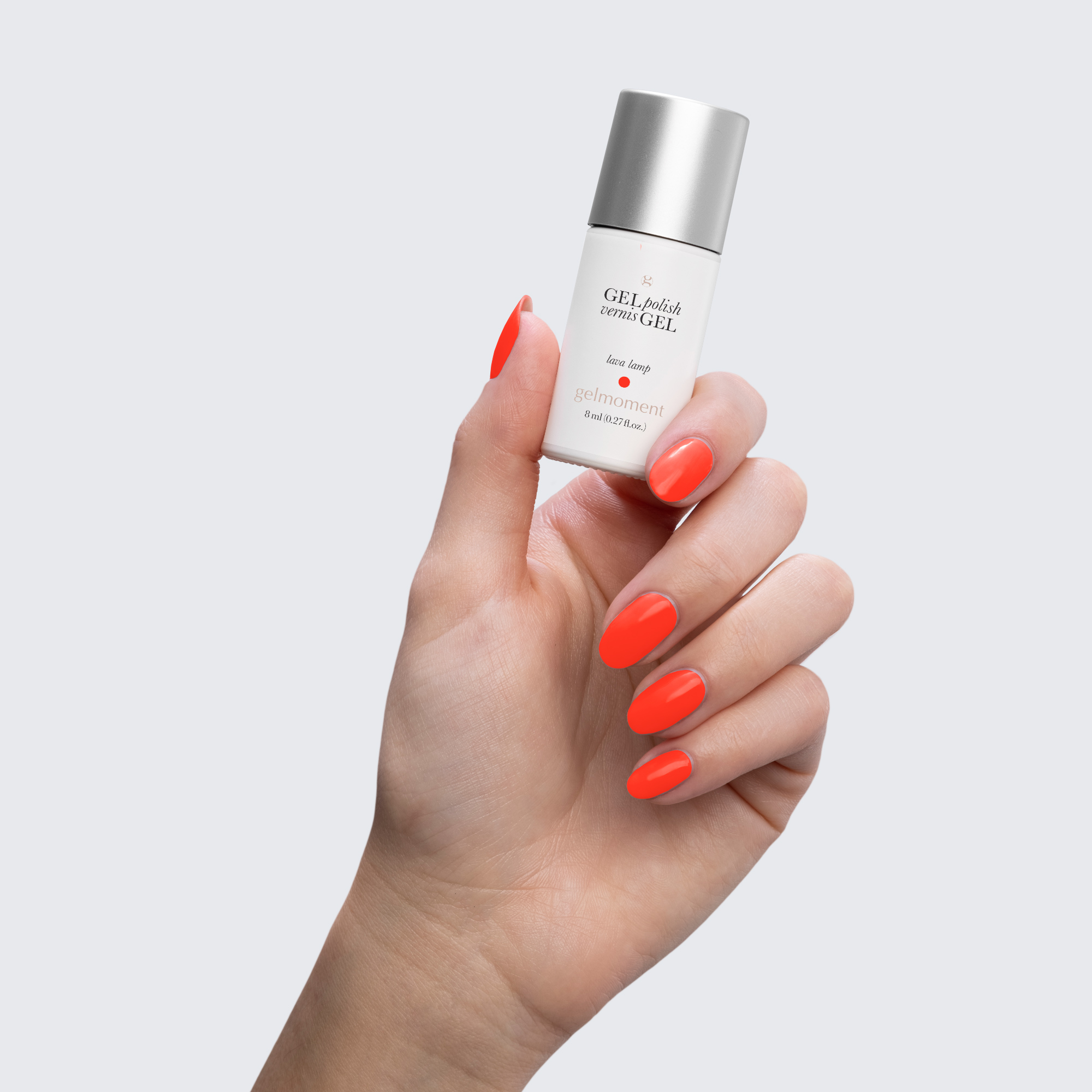 Neon orange. Bright. Cool undertone. Medium opacity / “coverage”.